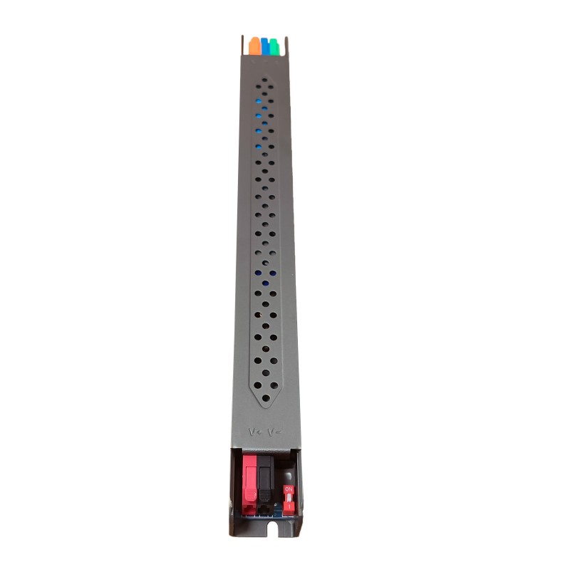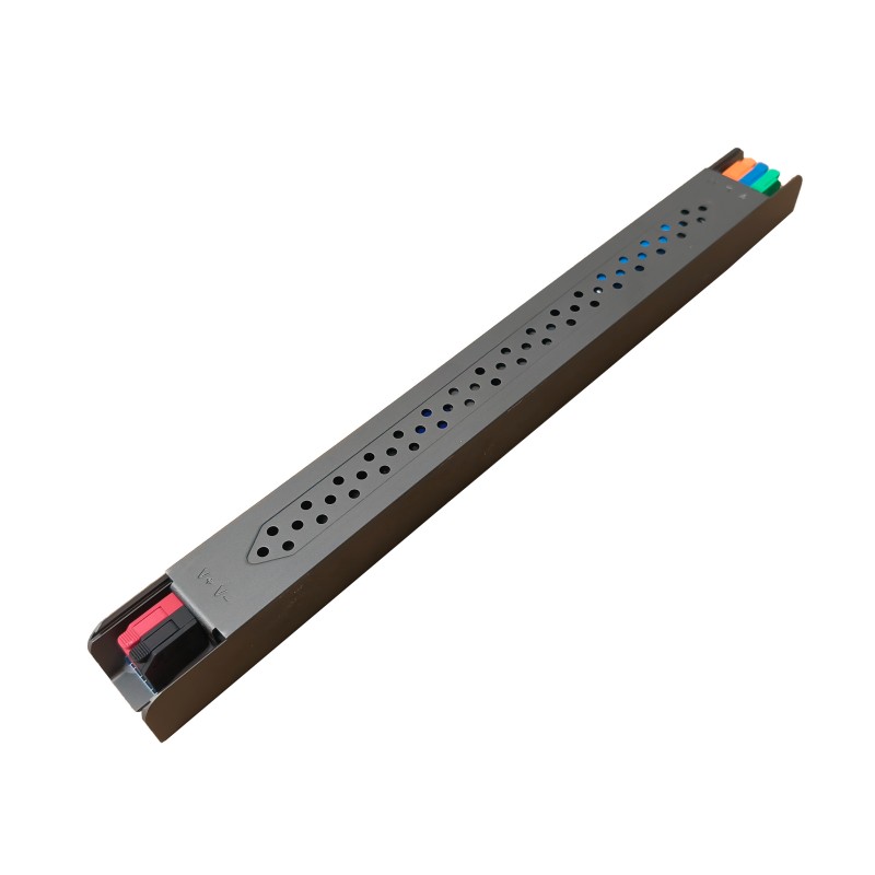 2、The power supply features an ultra-thin elongated metal housing with a matte dark gray surface finish, offering a compact and slender profile that facilitates installation in confined spaces (e.g., light troughs or interior ceiling cavities).